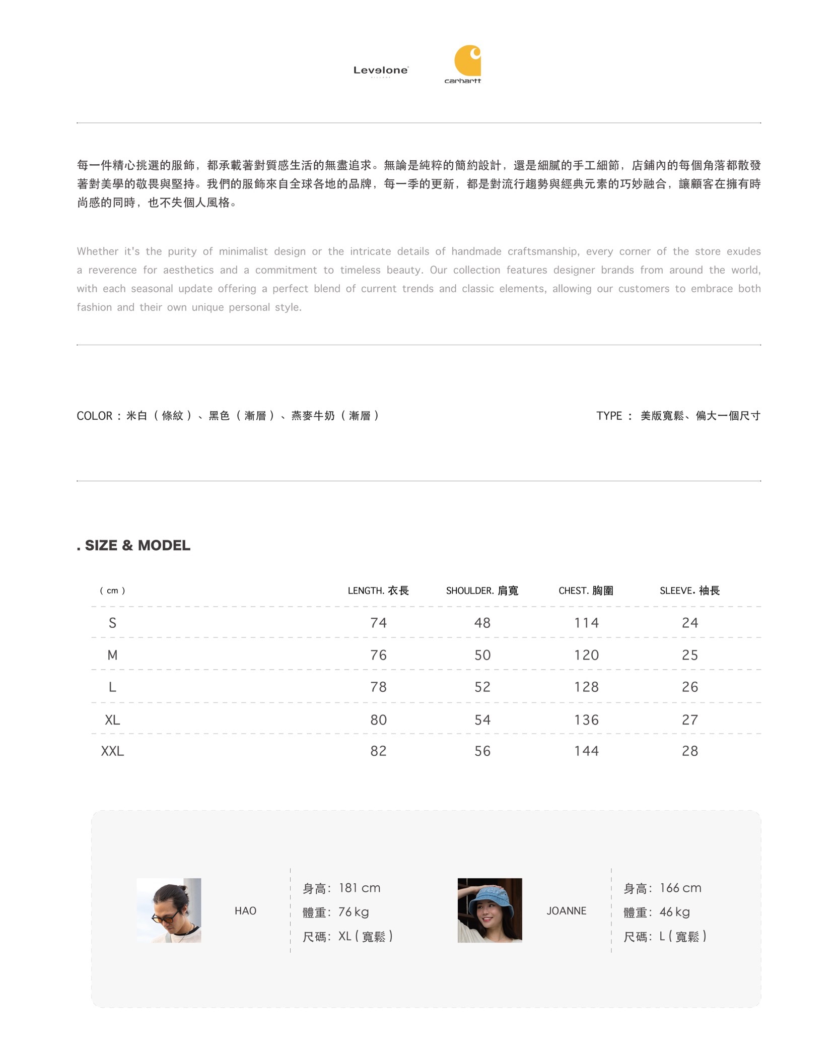 MODEL:男 180cm . 76kg - XL size、女 166cm - L size ( 詳細尺寸請見最後一張圖。)