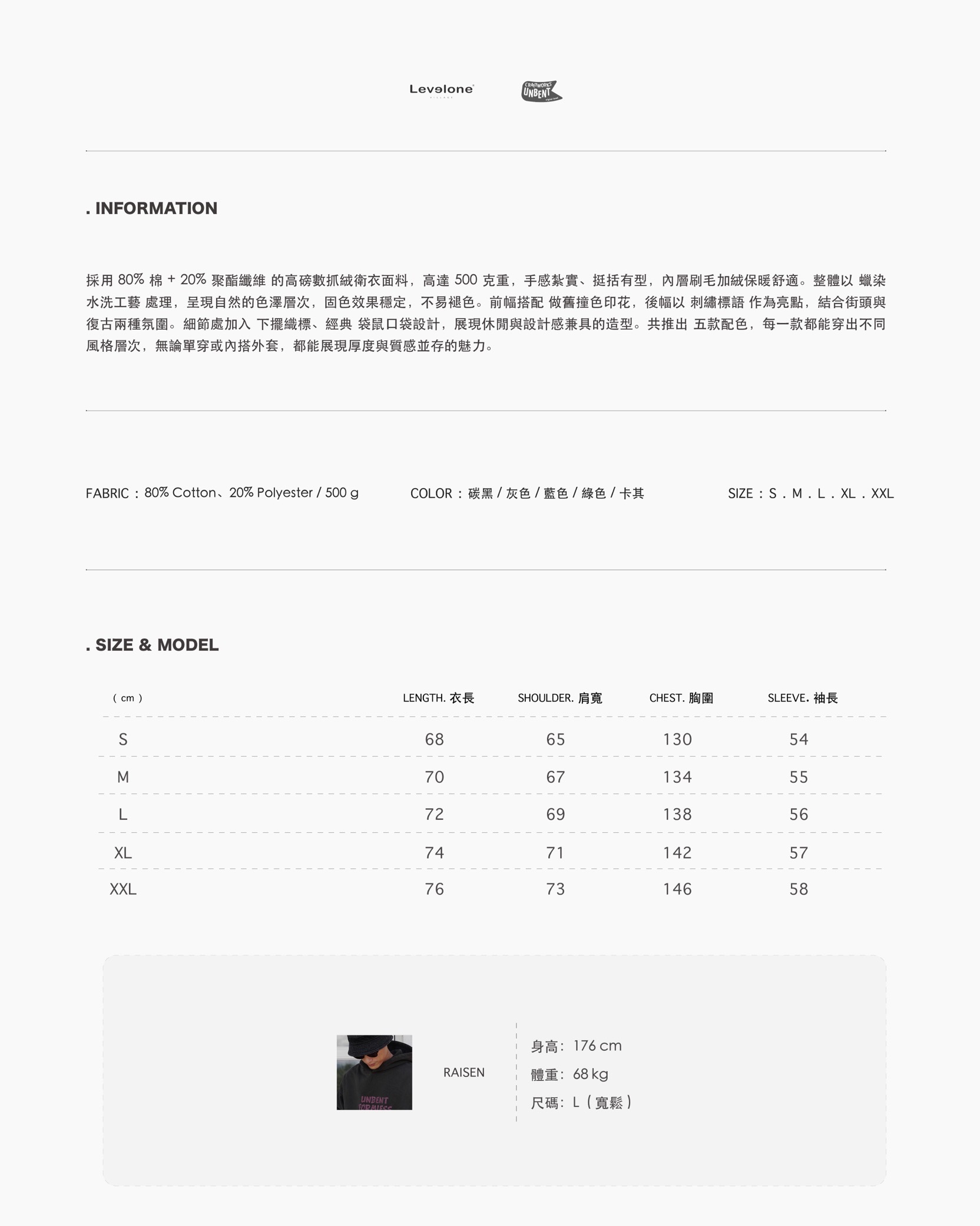 MATERIAL:80% Cotton. 20% Polyester。採用500G刷毛的重磅刷毛抓絨布製成。