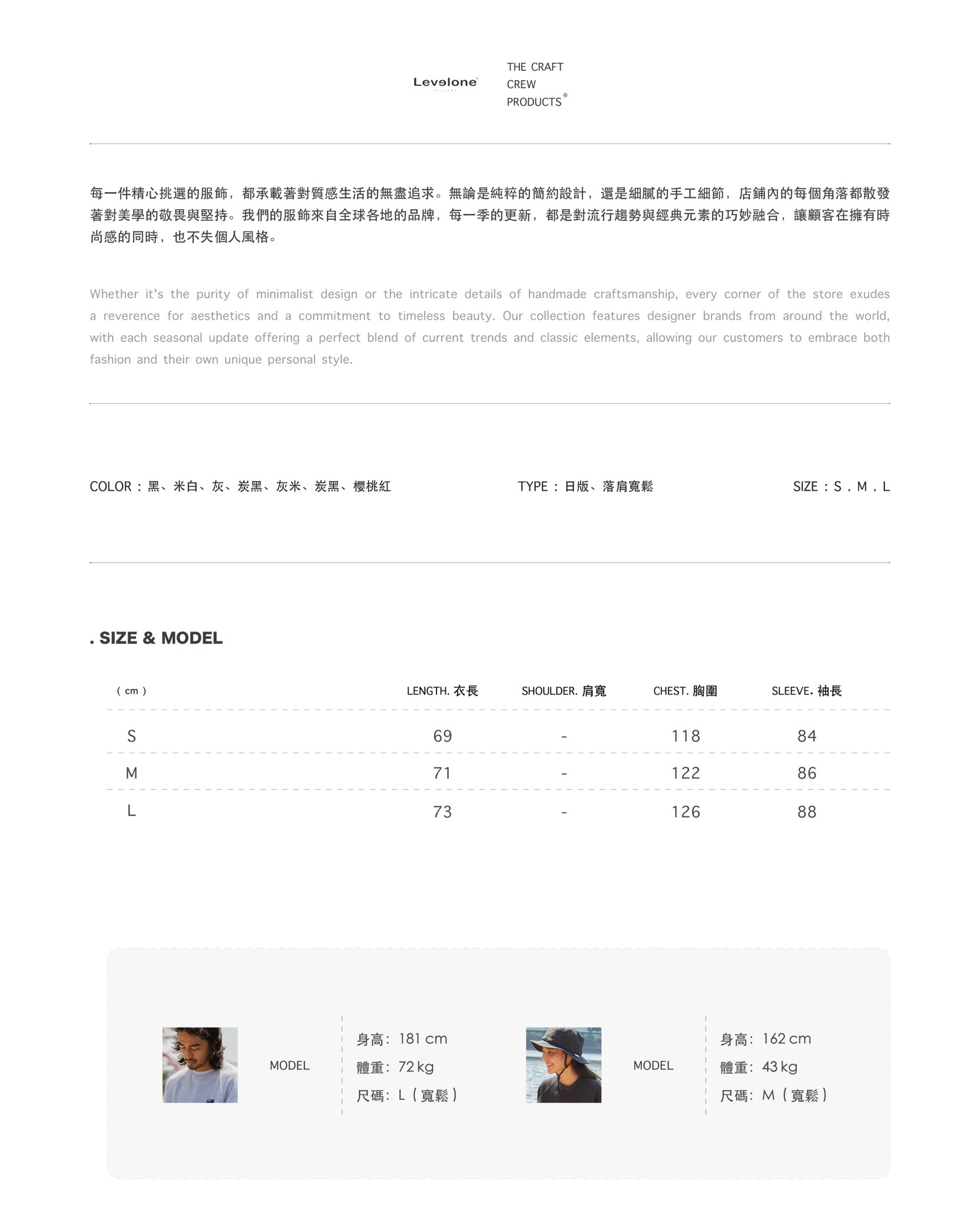 TYPE:落肩寬鬆、建議按照身高挑選。( 詳細尺寸請見最後一張圖 )