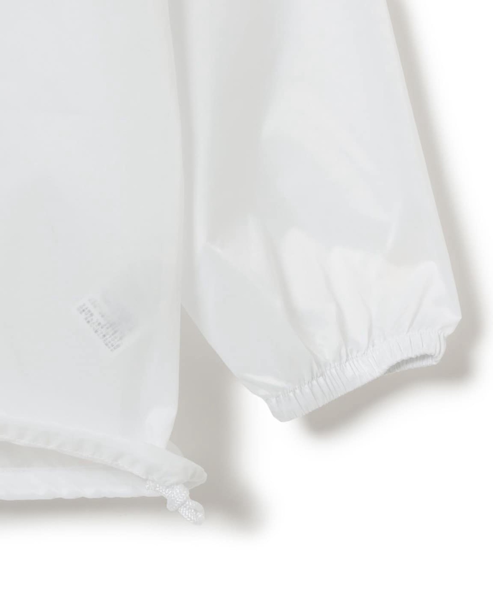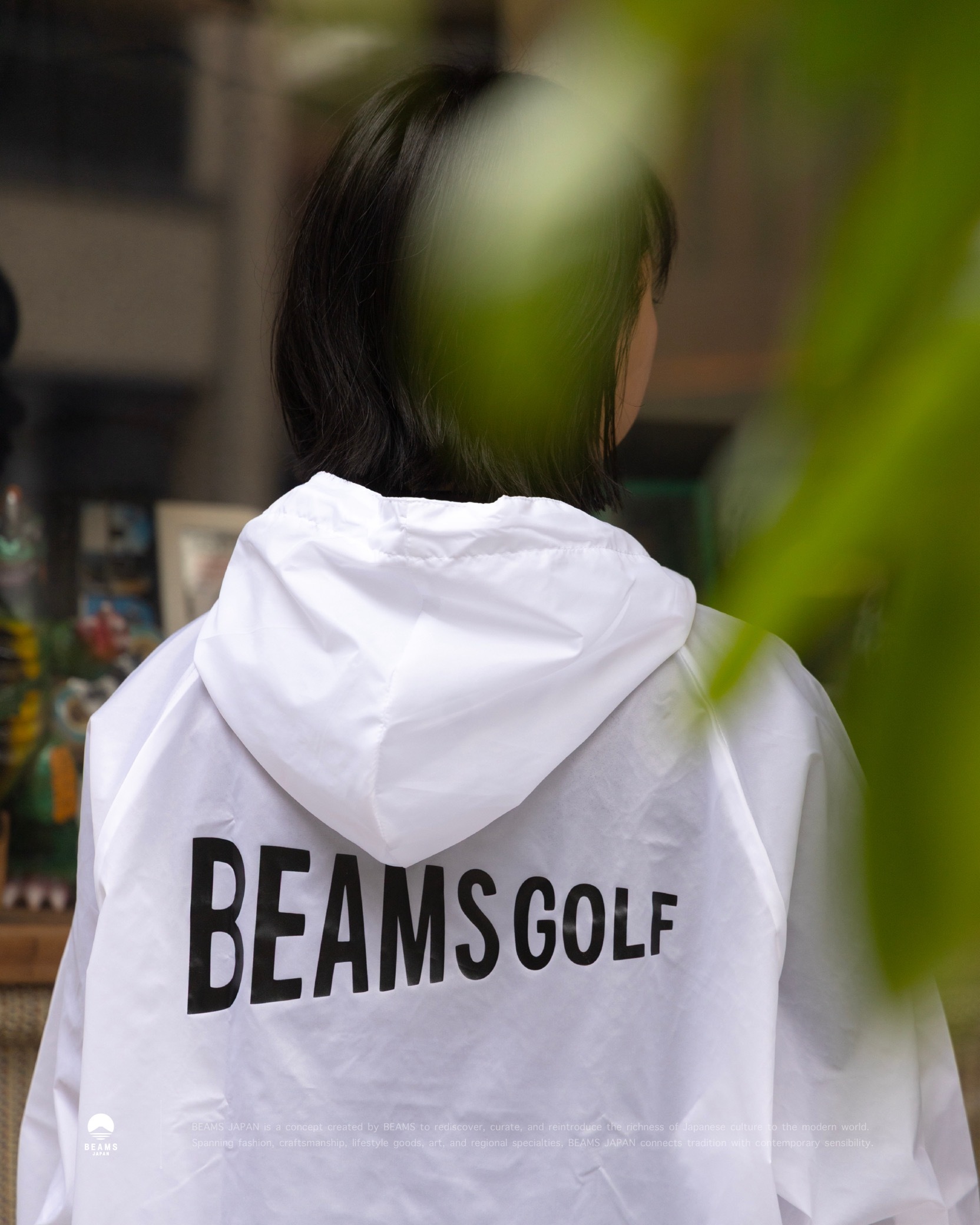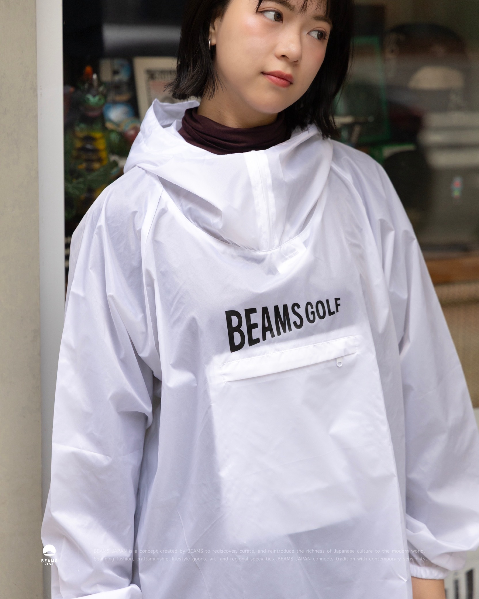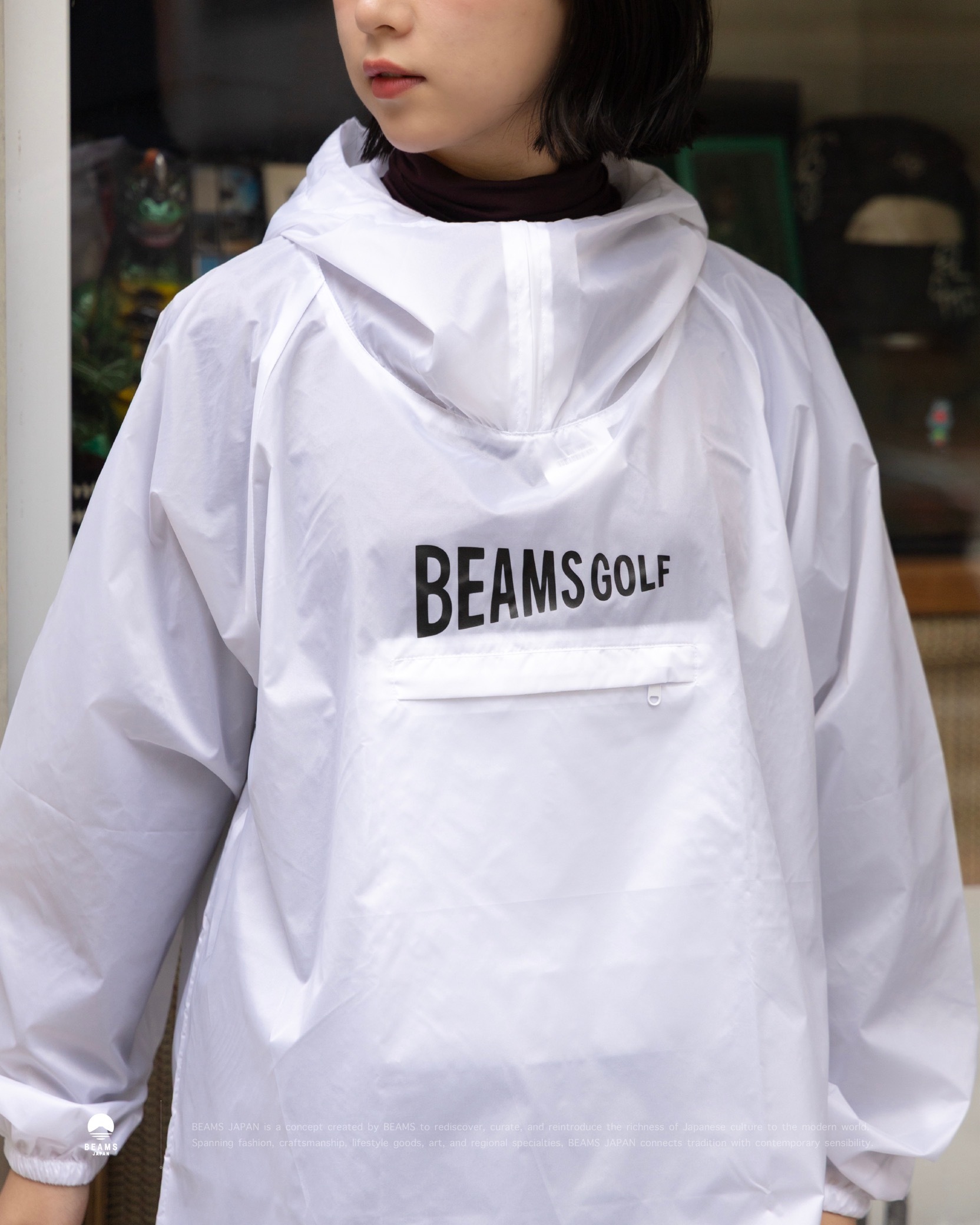 軽量な70デニールのナイロンファブリックを使用した、撥水機能付きの簡易レインパーカー。 適度なハリがあり、さらりとした着心地が特徴です。 フロントのポケット部分に収納できるパッカブル仕様で、ゴルフバッグやカートバッグにすっきり収まるサイズ感が魅力。〈BEAMS GOLF〉のロゴを前後に配したしたシンプルなデザイン。WHITEカラーのみ程良いスケルトン感があり、ゆったりとしたシルエットが動きやすさをキープします。ゴルフ以外にも屋外での行楽やレジャーに活躍する便利なアイテムです。