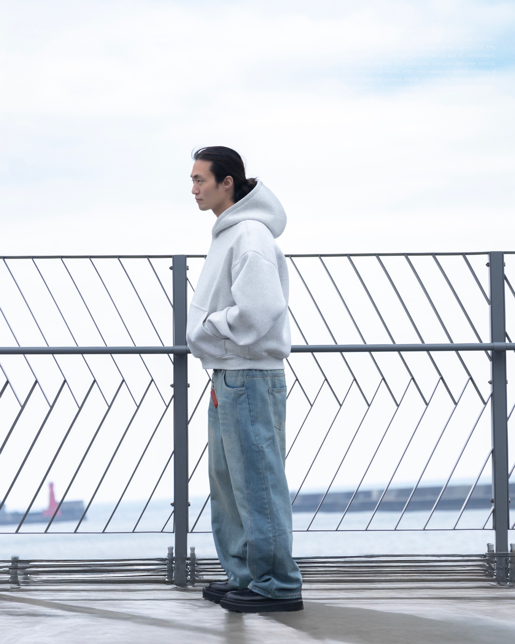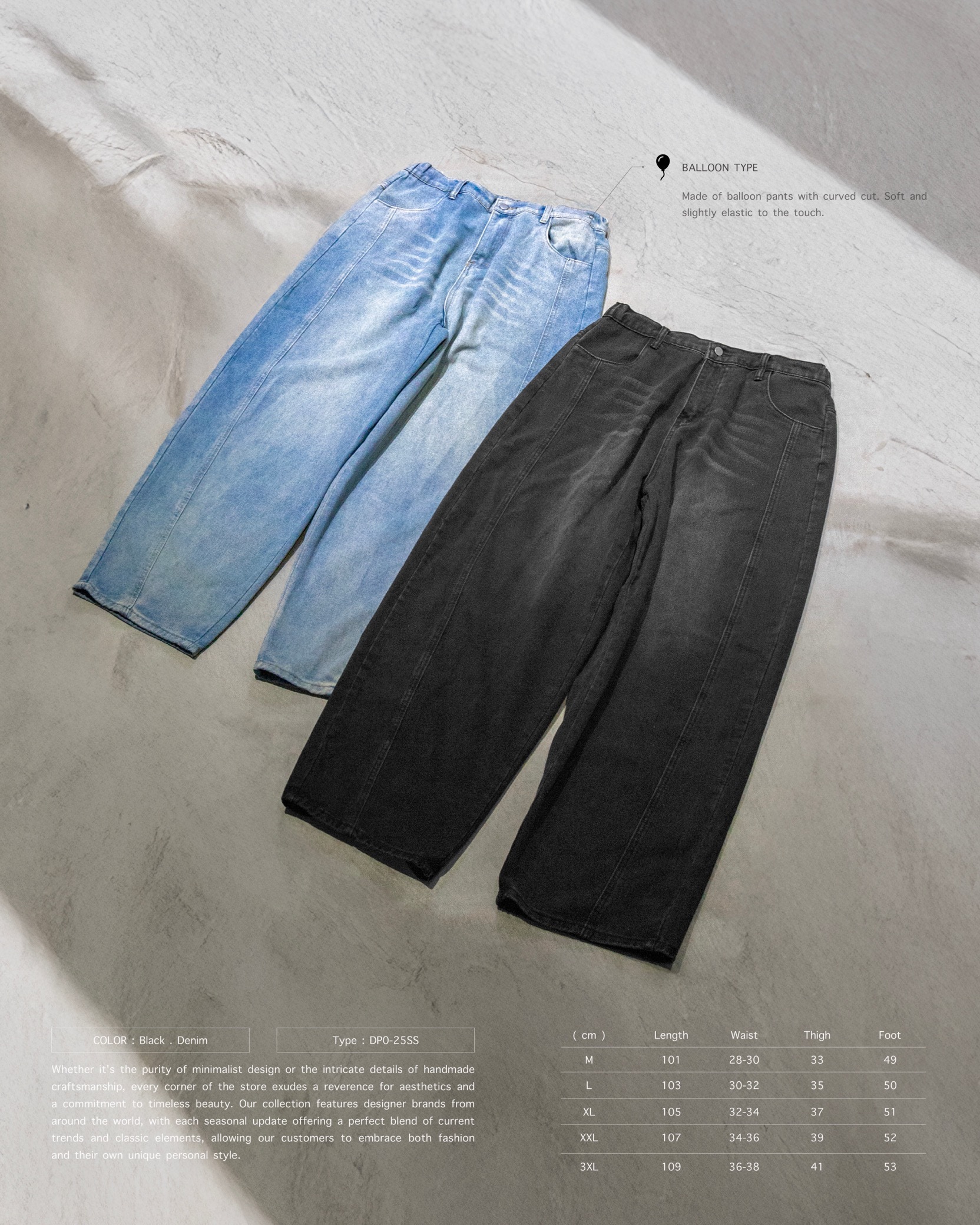 [ 9oz 厚磅 . 牛仔丹寧布 . 仿舊貓鬚 . Whiskers 工藝 . 側邊分割 . 切片拼接 . 氣球寬鬆廓形 . 後腰半鬆緊設計 . 牛仔褲 ]