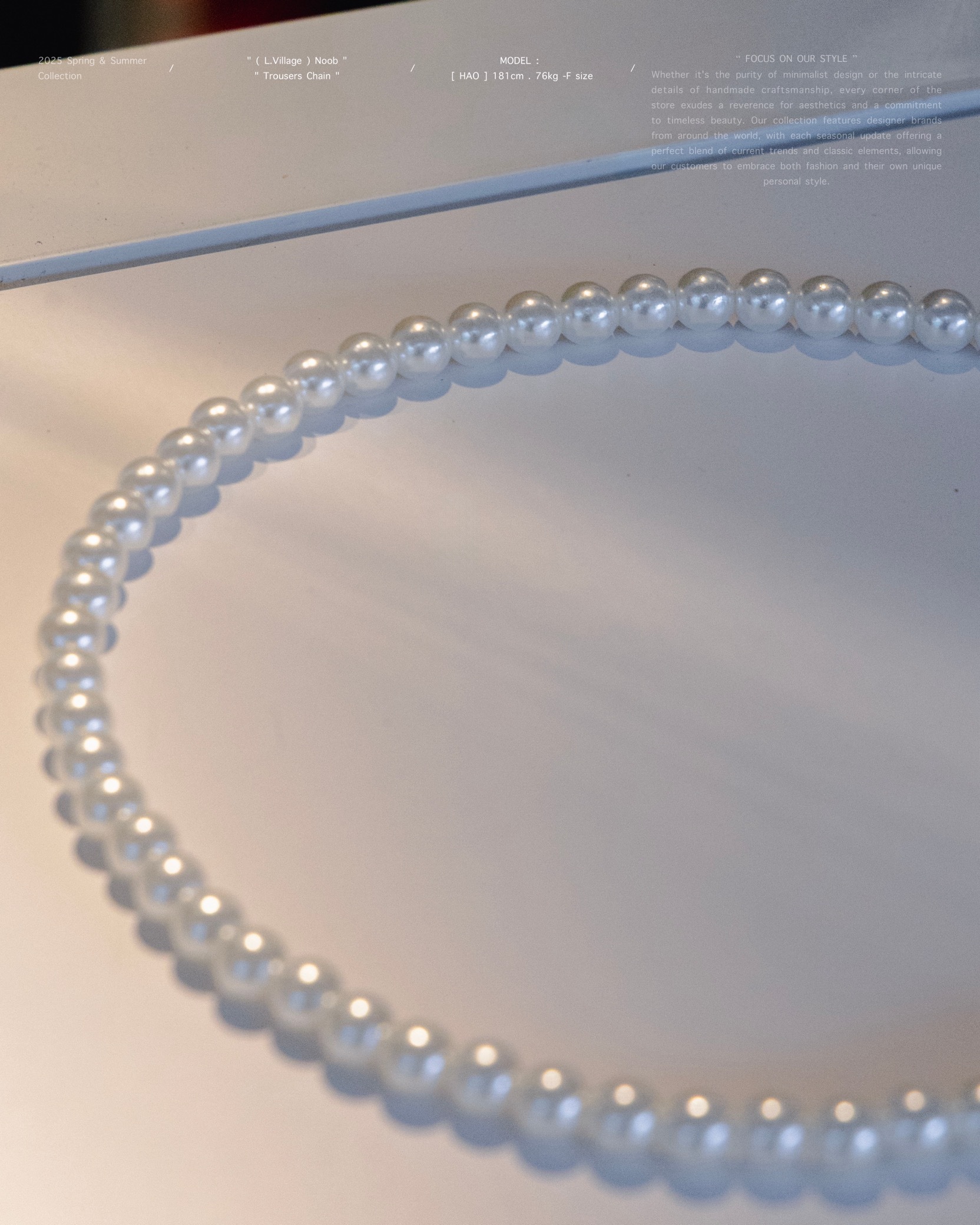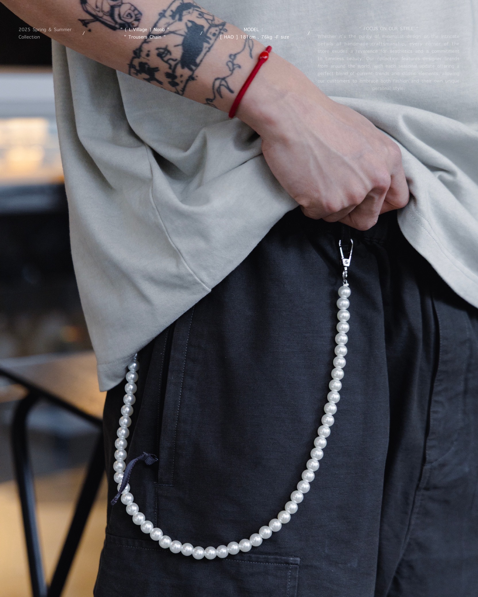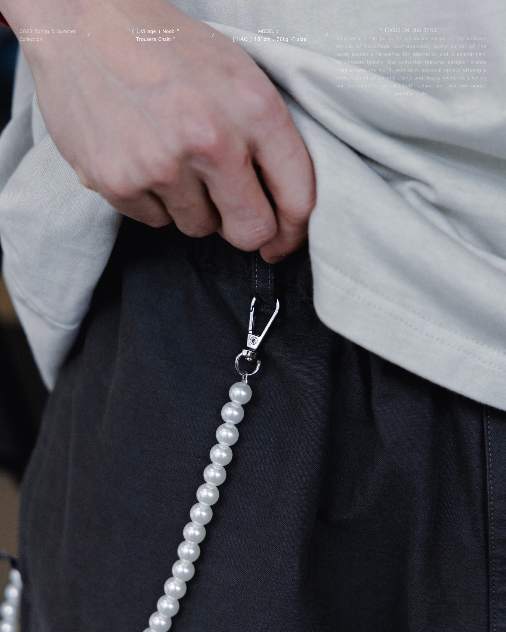 這款珍珠褲鍊以整排光澤溫潤的人造珍珠串聯而成,搭配銀色金屬鉤扣,優雅中帶有街頭感。長度為60公分,無論是垂掛於褲頭、包包側邊或層疊配戴,皆能輕易點綴出與眾不同的細節層次。推薦給偏好柔和風格或想在日常穿搭中加入一點復古氣息的你。