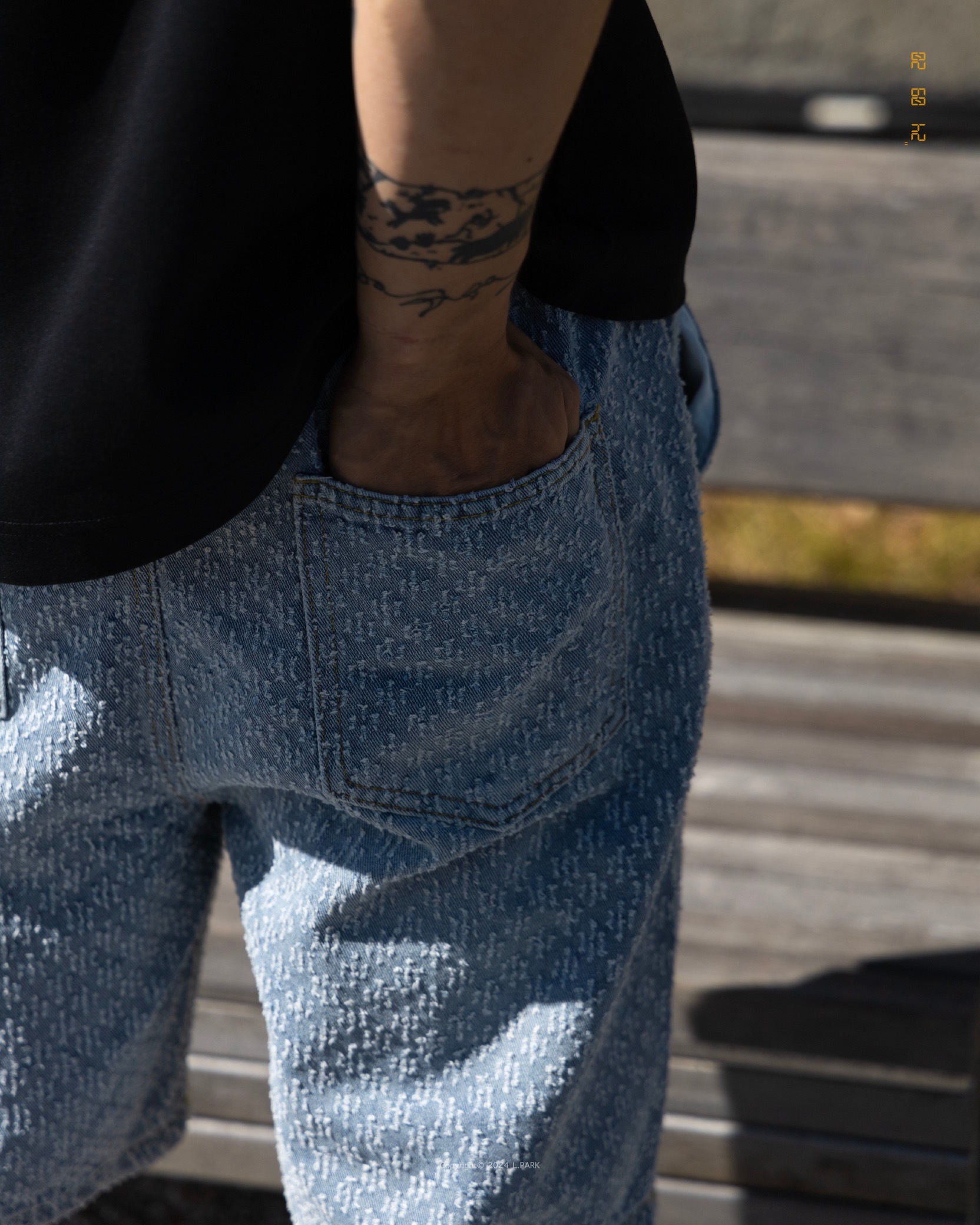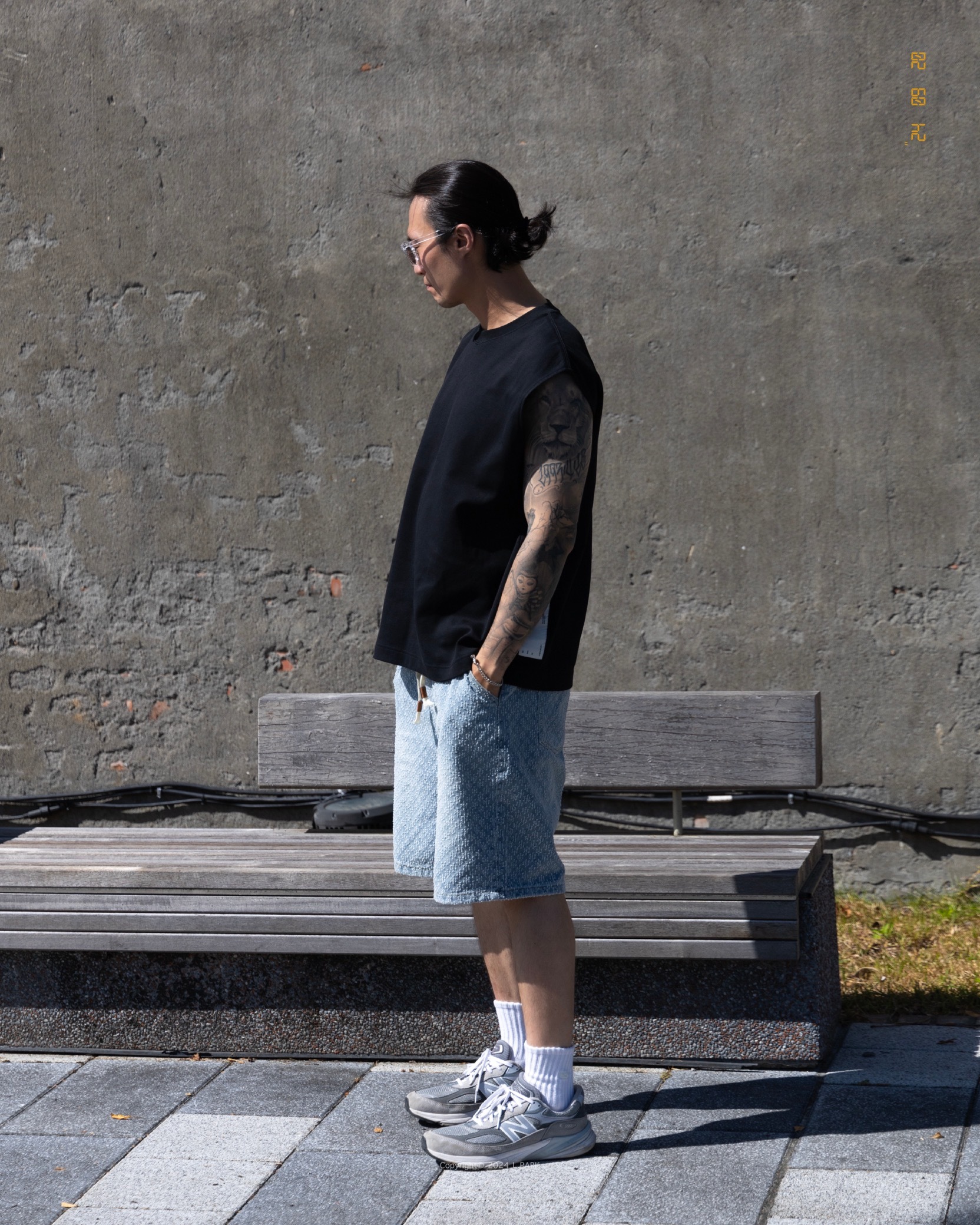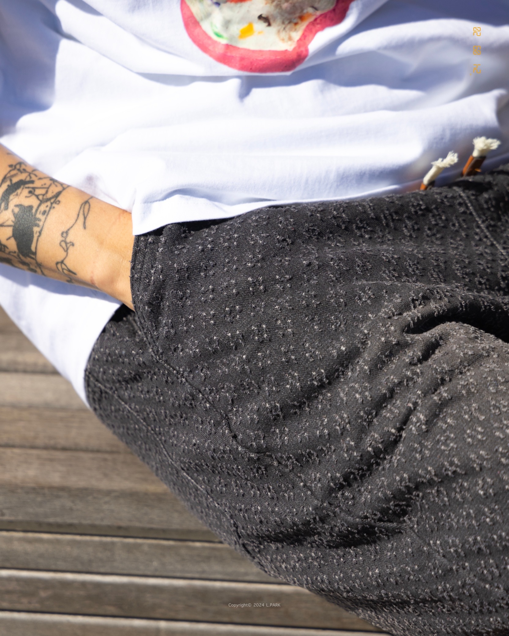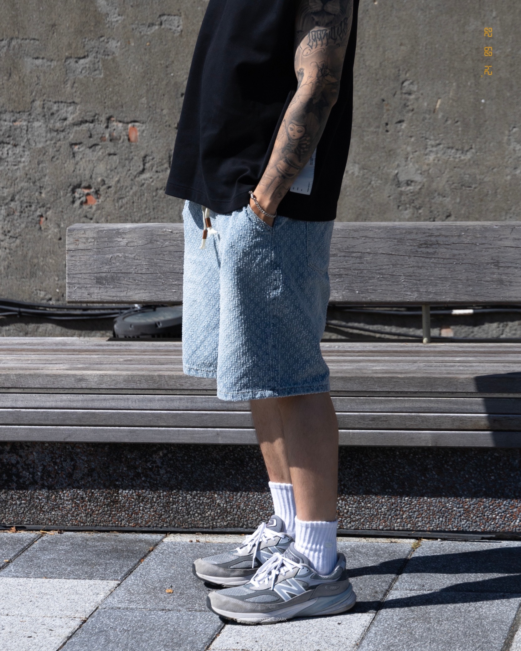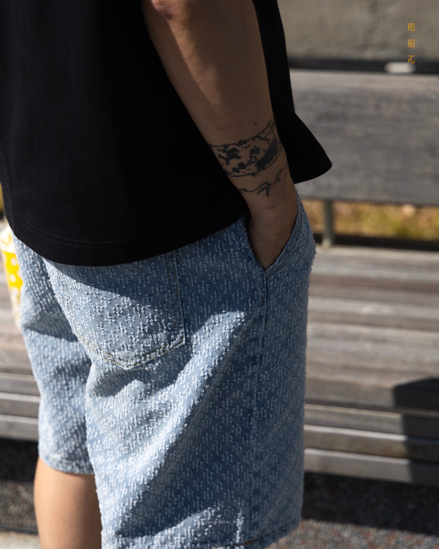 [ 提花牛仔布料 . 作舊刷色 . 特殊破壞 . 兩側口袋 & 後口袋 . 腰圍抽繩 . 短褲 ]